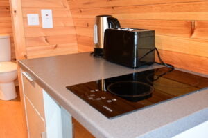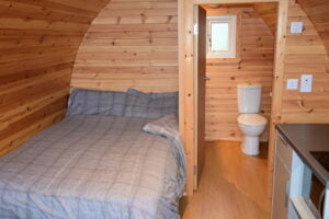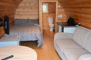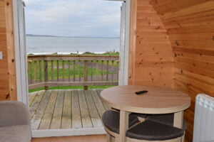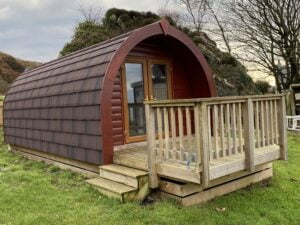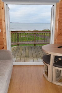 Want to watch the sun setting behind the islands and wake up to the sound of the ocean waves? Then a stay in one of our two glamping pods may be just the thing. Our pods sleep two people in cosy beach side comfort. As well as a double bed, your pod has its own ensuite shower room and toilet facilities, as well as cooking facilities, tv, small dining area and tea and coffee making facilities. Double doors lead onto your own compact decking area where you can enjoy your morning coffee as your plan your day, or later on, watch as the sun slips below the horizon as the waves wash onto the beach. What could be better?